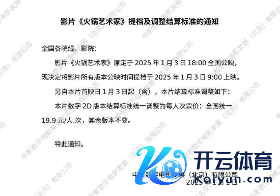 同日,由焦俊艳、张琪、于洋等主演的《暖锅艺术家》刊行方也向影院发布“提档及调理结算规范的告知”:影片原定于2025年1月3日18:00寰宇公映,现决定提档于2025年1月3日9:00上映。另1月3日起(含),本片结算规范调理为,数字2D版块结算规范寰宇斡旋19.9元/东谈主.次,其余版块不变。