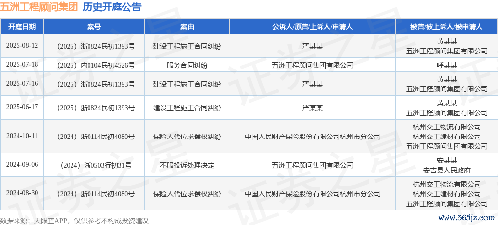案号:(2025)浙0824民初1393号审理法院:开化县东说念主民法院案由:确立工程施工协议纠纷当事东说念主信息: 原告/上诉东说念主:严某某 被告/被上诉东说念主:黄某某、五洲工程照应人集团有限公司开庭日历:2025年8月12日把柄统计,近一年内以五洲工程照应人集团有限公司为当事东说念主的历史开庭公告有7则,其中案由为“确立工程施工协议纠纷”的公告以3则居首,其次为“保障东说念主代位求偿权纠纷”有2则,“抵抗投诉惩处决定”有1则。历史开庭公告如下: